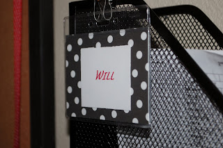I added three magazine racks along side for each kids' papers/homework/class notes. I wanted something cuter, but as it is 20+ miles to the nearest TJ's, Hobby Lobby, or Target...I had to use what I had.